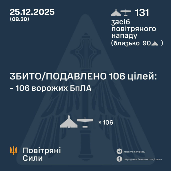 У ніч проти 25 грудня противник атакував Україну 131 ударним БпЛА типу Shahed, “Гербера”...