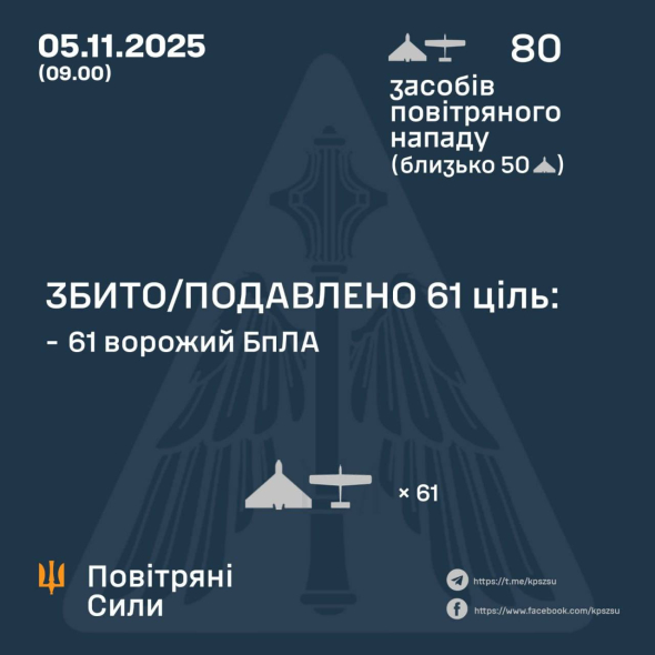 У ніч проти 5 листопада противник атакував Україну 80-ма ударними БпЛА типу Shahed, “Гербера” і безпілотниками інших типів, близько 50 із них – дрони Shahed.